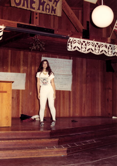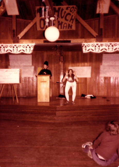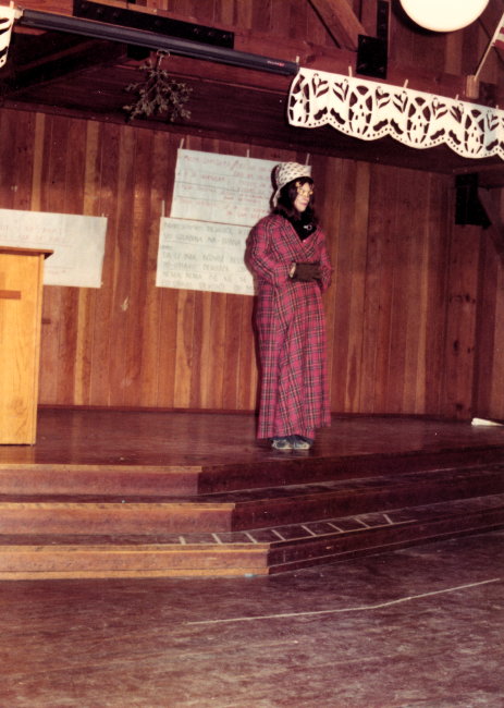 I would now like to present a typical colorful peasant of the Holidejkemp area, dressed in the intricate local costume. She is actually Laurie Gordon, co-artistic director of Kolo Ansambl Narodni Ersatz, a noted expert on Esperanto culture.