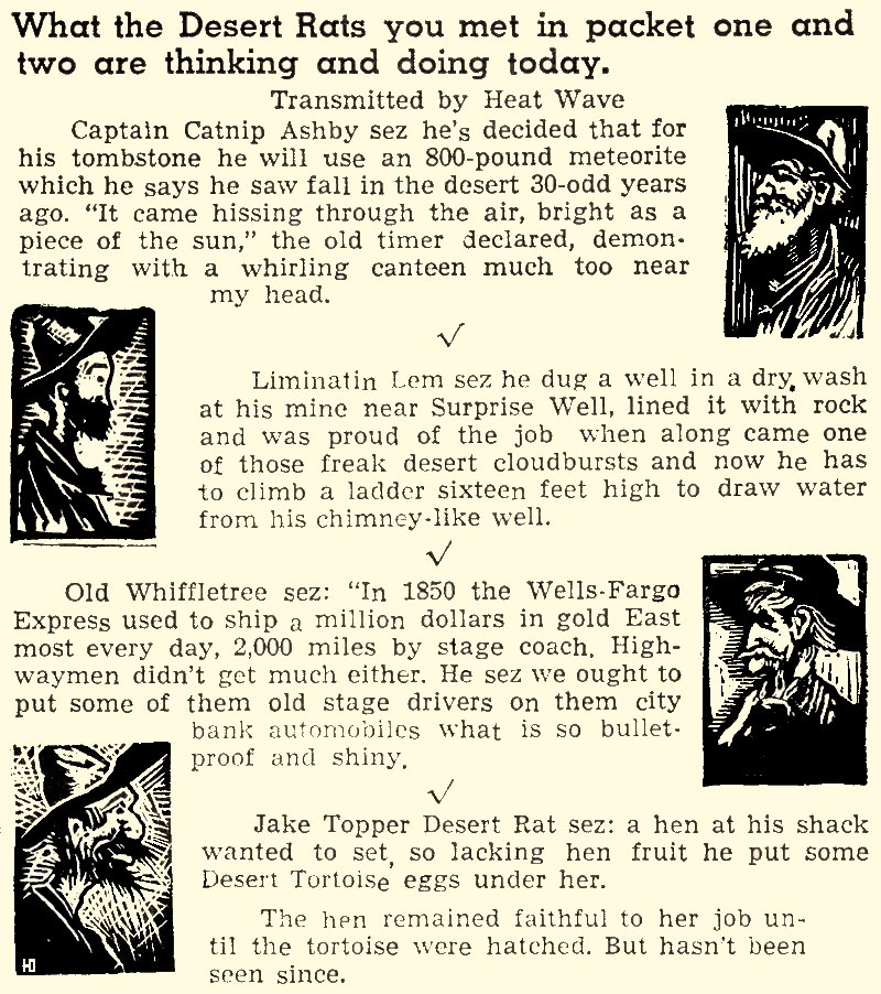 —His hobby got so important he was sent for by that Hobby Lobby radio outfit, and got a ride way back to New York just to tell them about wood-pecker holes. My advice is, get yourself a hobby, if you are staying, and learn to be a honest to gosh Desert Rat.